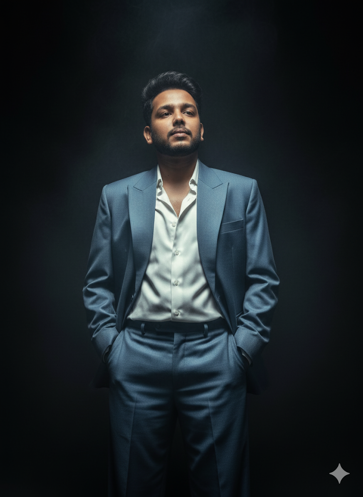A hyper-realistic cinematic editorial portrait of the uploaded person (preserve face 100%). He stands tall in a dark moody studio,surrounded by soft drifting smoke under a dramatic spotlight.Outfit:Oversized slate-blue luxury suit with wide-leg trousers, paired with a slightly unbuttoned white silk shirt. Both hands tucked casually in pockets, shoulders relaxed, confident expression, head tilted slightly upward