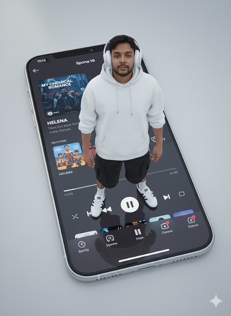 Create a sleek, modern photo of image (based on the uploaded reference real face) standing confidently on a giant iphone 16 screen. the screen displays a spotify playlist featuring the song “MY CHEMICAL ROMANCE HELENA.” My Face wearing 2025 airpods max, an oversized white hoodie-style shirt, black cargo shorts, and crisp adidas samba white. the scene is shot from a high top-down angle to highlight the massive scale of the phone. the vibe is minimal, stylish, and futuristic