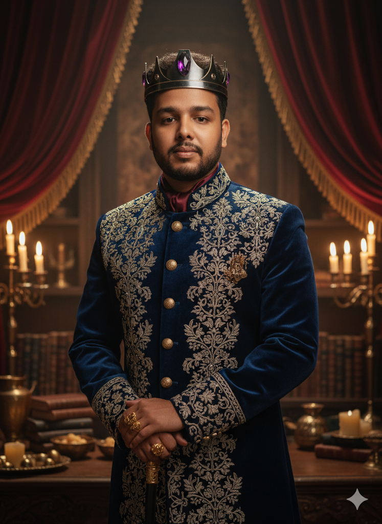Create a high-resolution, 1:1 square image of the person from the uploaded photo, styled as a modern king. He should be in an opulent setting with velvet drapes, golden accents, and soft candlelight. He wears a tailored dark velvet coat with intricate embroidery and elegant accessories. The background should feature soft-focus ornate elements that suggest wealth. The lighting should highlight his face, adding depth, authority, and drama for a majestic, commanding, and refined final image