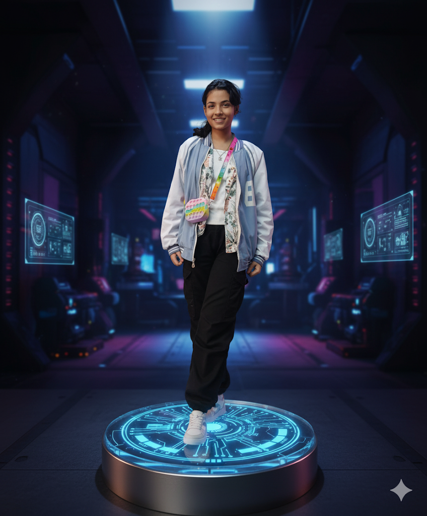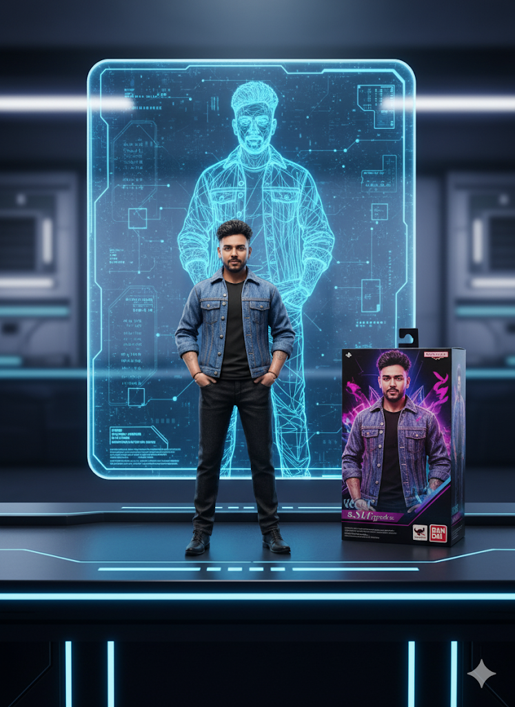 A futuristic hyper-realistic 3D render of a custom action figure on a sleek desk. The action figure is modeled after the uploaded person (replace with user’s photo), wearing a denim jacket, black t-shirt, black jeans, black shoes, sunglasses, and hands in pockets. Behind it is a large transparent holographic screen showing the 3D modeling wireframe of the same person in the same pose, glowing with neon blue and purple lights. The desk has embedded LED strips glowing softly. Next to the figure is a futuristic action figure box with anime-style artwork of the same person, styled like a Bandai SHFiguarts package but with neon accents and holographic effects. The environment has a sci-fi lab vibe, with subtle glowing panels and ambient futuristic lighting