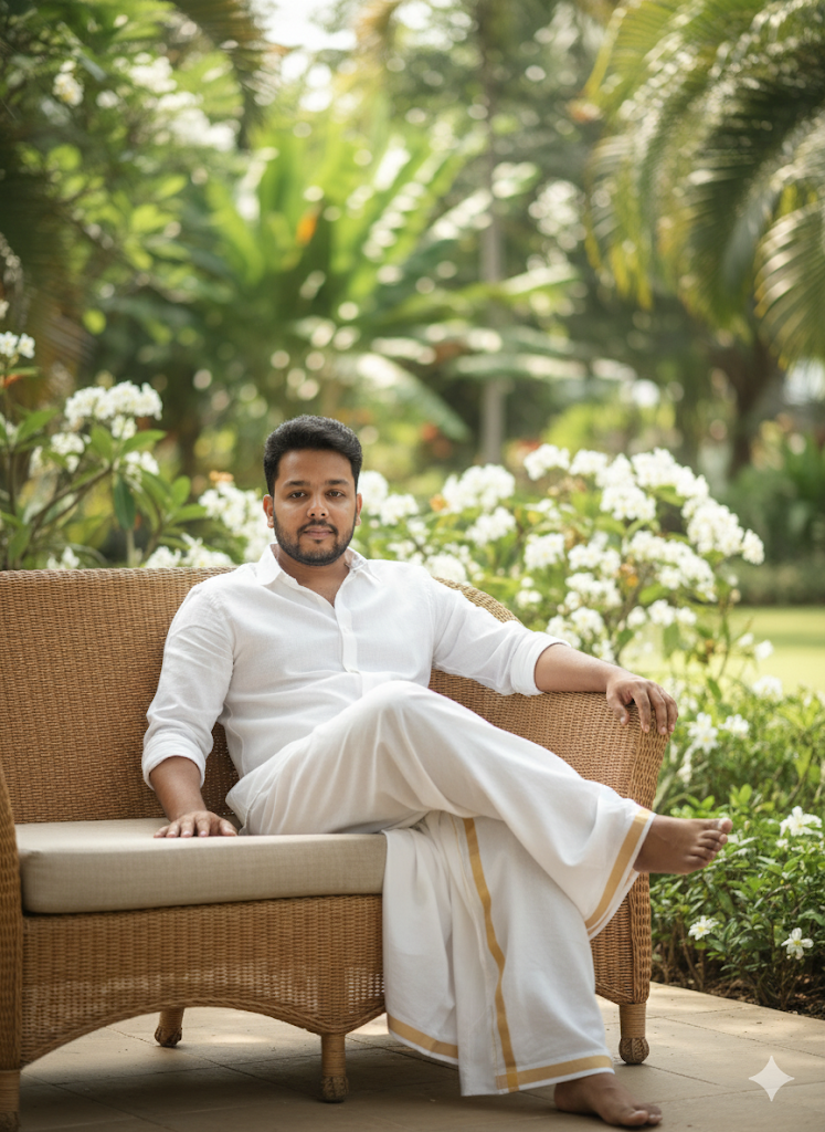 Generate a 4k DSLR Photography of A distinguished man(same person in image and exactly same facial feature) reclines confidently on a wicker sofa in an open, garden-side patio, framed by lush greenery and soft-focus flowering plants in the background, giving the scene a calm, upscale resort ambiance. He wears a crisp white shirt paired with a flowing white dhoti finished with a subtle gold border the fabric draping smoothly across his legs and pooling neatly near his legs