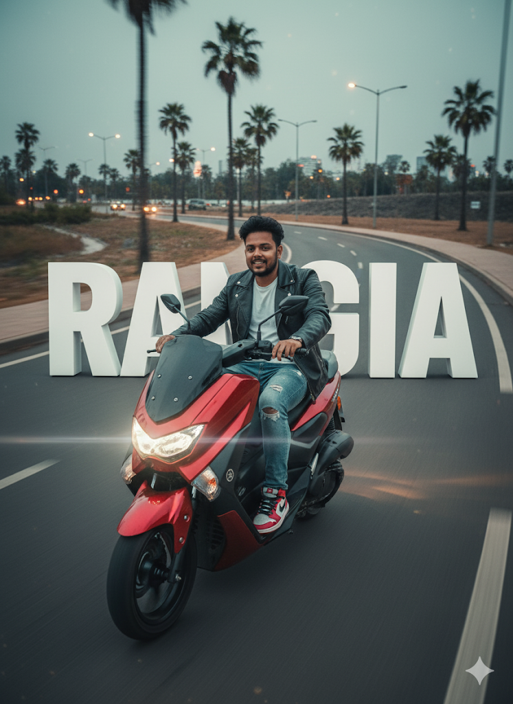 A cinematic image of a man (based on an uploaded photo) smiling while riding a red Yamaha NMAX, wearing a jacket, white t-shirt, ripped jeans, and red and black Nike Air Jordan shoes. Place [RANGIA] in bold 3D white letters. Taken from a dynamic image