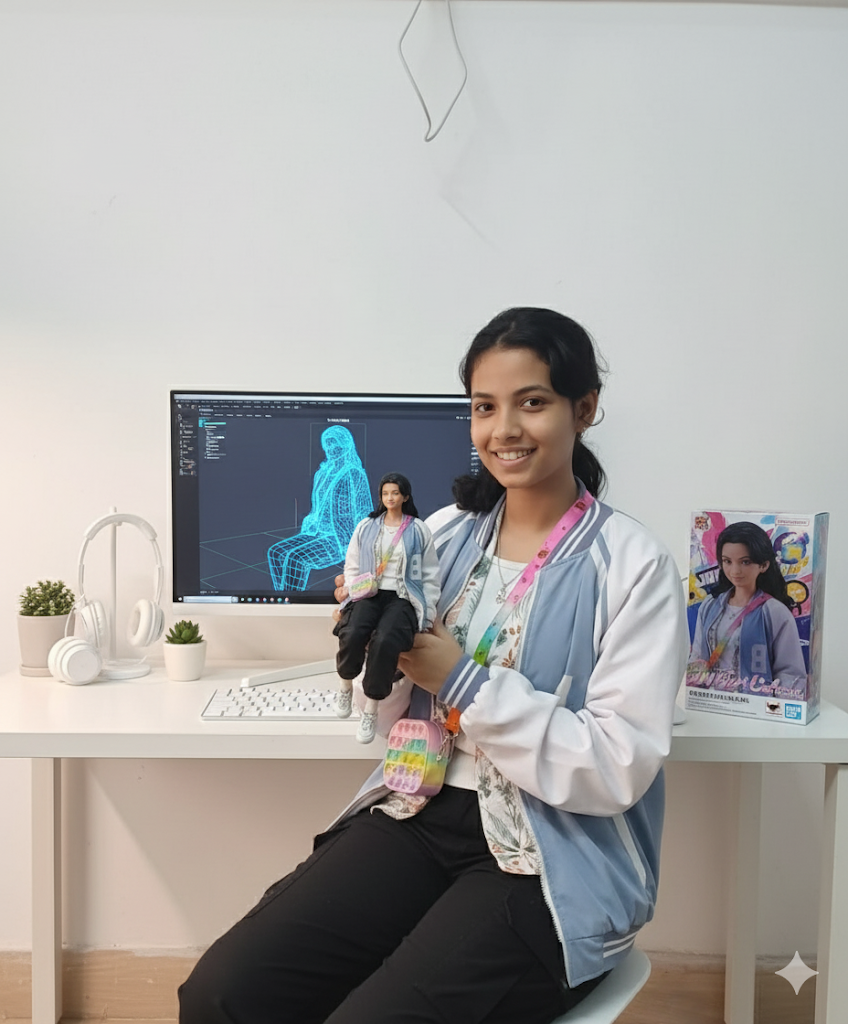 Create a super realistic portrait of a woman (photo attached). Sitting at a desk in a bright light room with a white background and lots of cute white accessories surrounding her. She smiles while holding her own exquisite collectible statue. Accentuating the statue as the main target in 1/7 scale as realistic as the attached image. Behind it is a computer monitor showing the 3D modeling wireframe of the same person in the same pose, On the table next to her, she has a box of branded toys with her photos and the statue of the same design