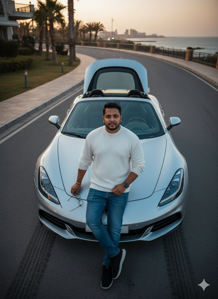 A bird’s-eye view photo showing a man leaning against the front of a luxurious and sophisticated sports car with the roof open. Character details of an indian man in his 23 years, athletic, short, neat hairstyle combed to the side. Wearing an oversized white sweater, jeans, black sneakers, glasses, and a smartwatch. Standing and leaning against the hood of the car, the pose is elegant and masculine. His face gazes into the camera with a calm and confident expression