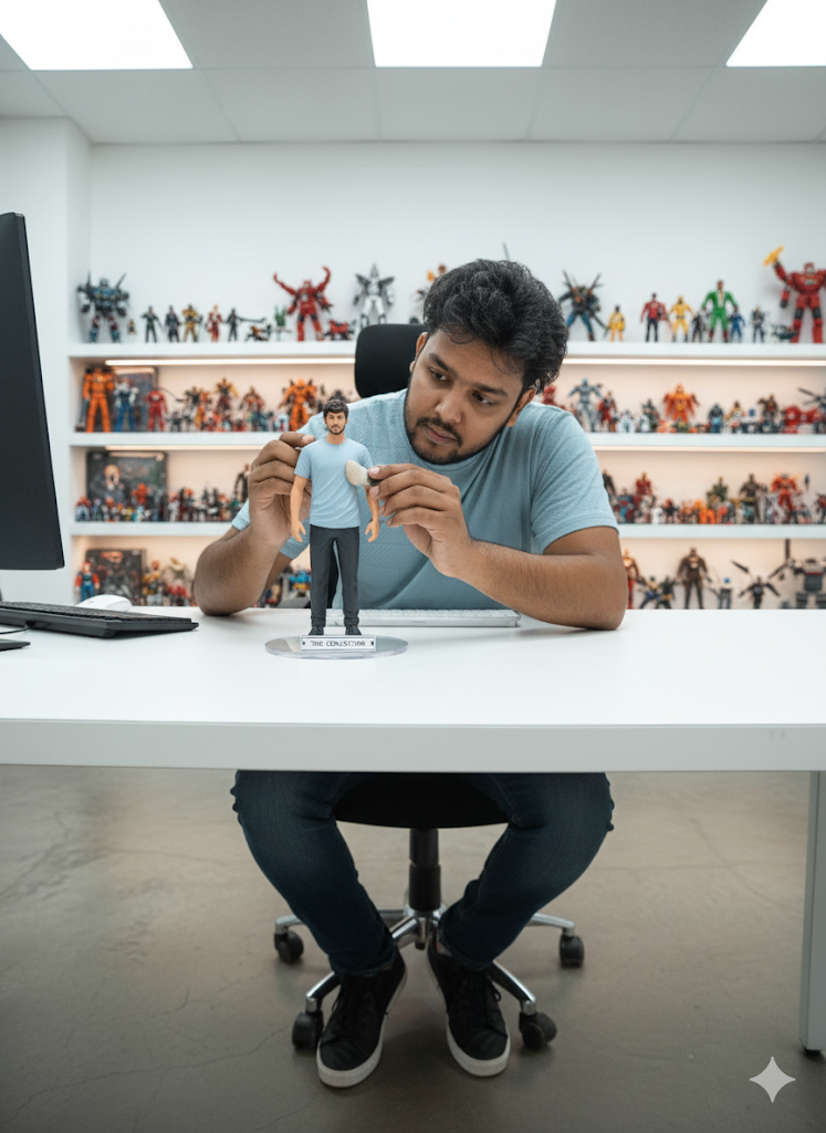 Create a 1/7 scale commercialized figurine of (the character in the picture) , realistic style, in a real environment. Figurine placed on a computer desk. has a round transparent acrylic base. Next to the desk is the real person in the picture, in the real life size with the same attire as in the picture and the figurine, cleaning the figurine carefully with a fine brush. in a modern styled studio room, brightly lit. With some collection of toys and action figures in the background